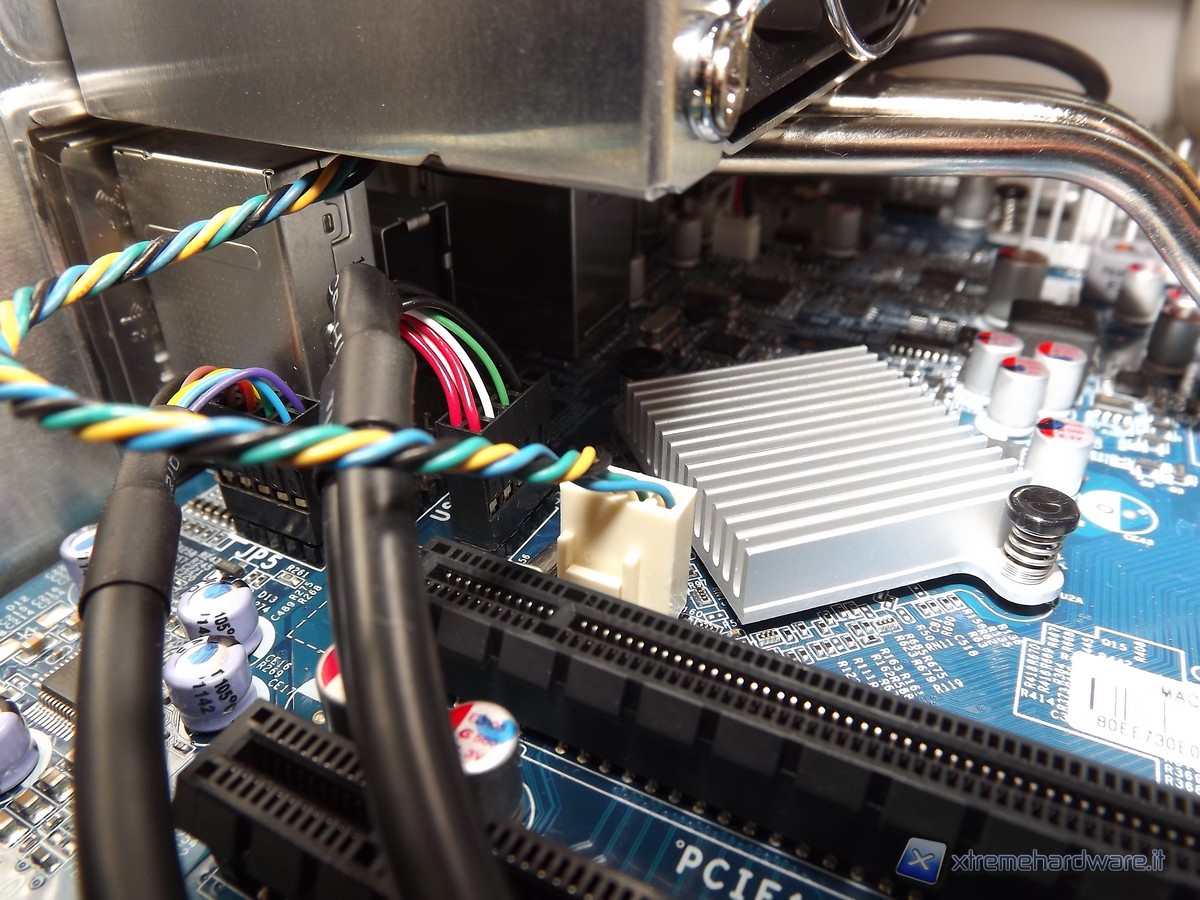 Sopra il socket LGA 1155 troviamo il Southbridge Intel Z68 coperto da un dissipatore di tipo passivo e girato di 45°. A fianco troviamo lo slot PCI-Express x16 e quello x1. Nel PCB troviamo altri connettori, come quello per le ventole, delle USB, RS232 e vari connettori audio.