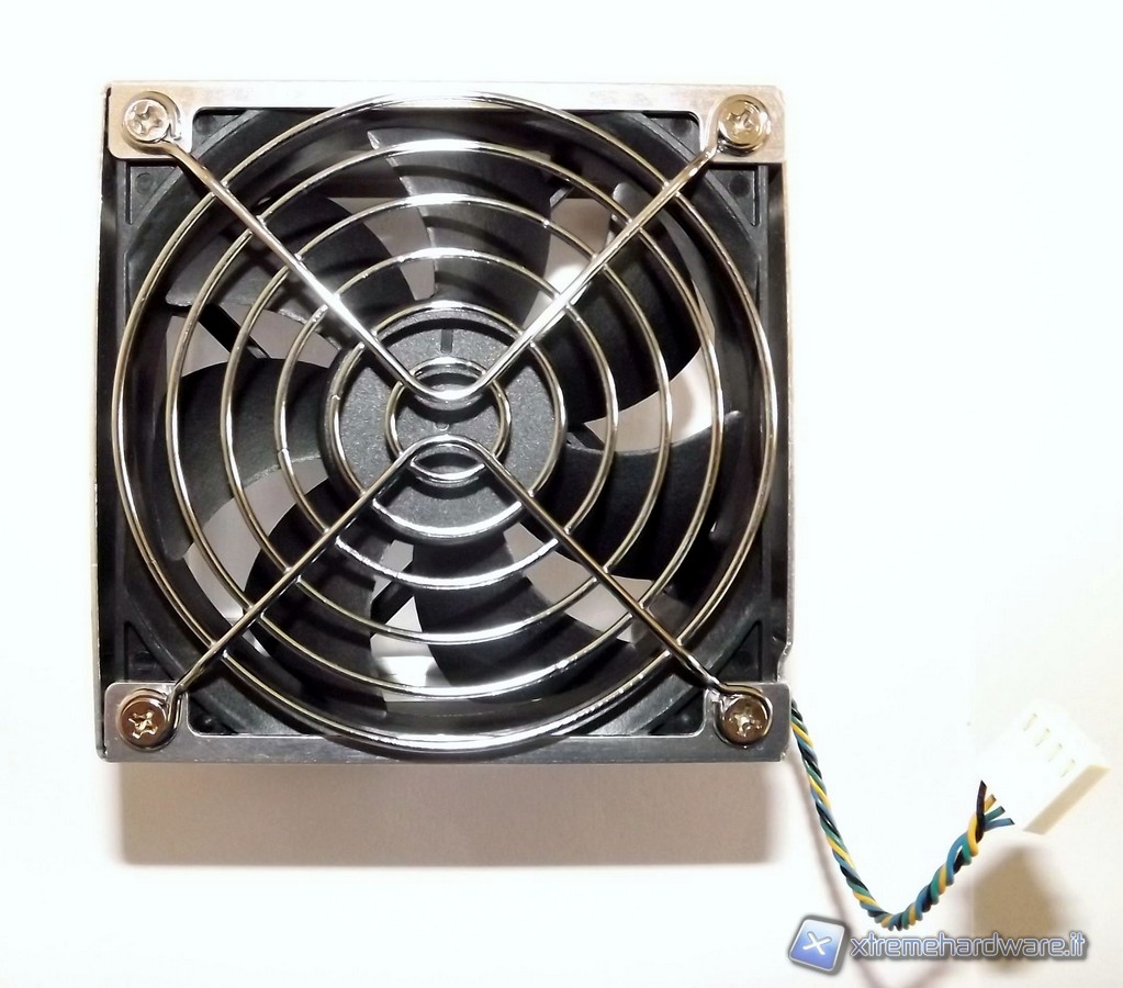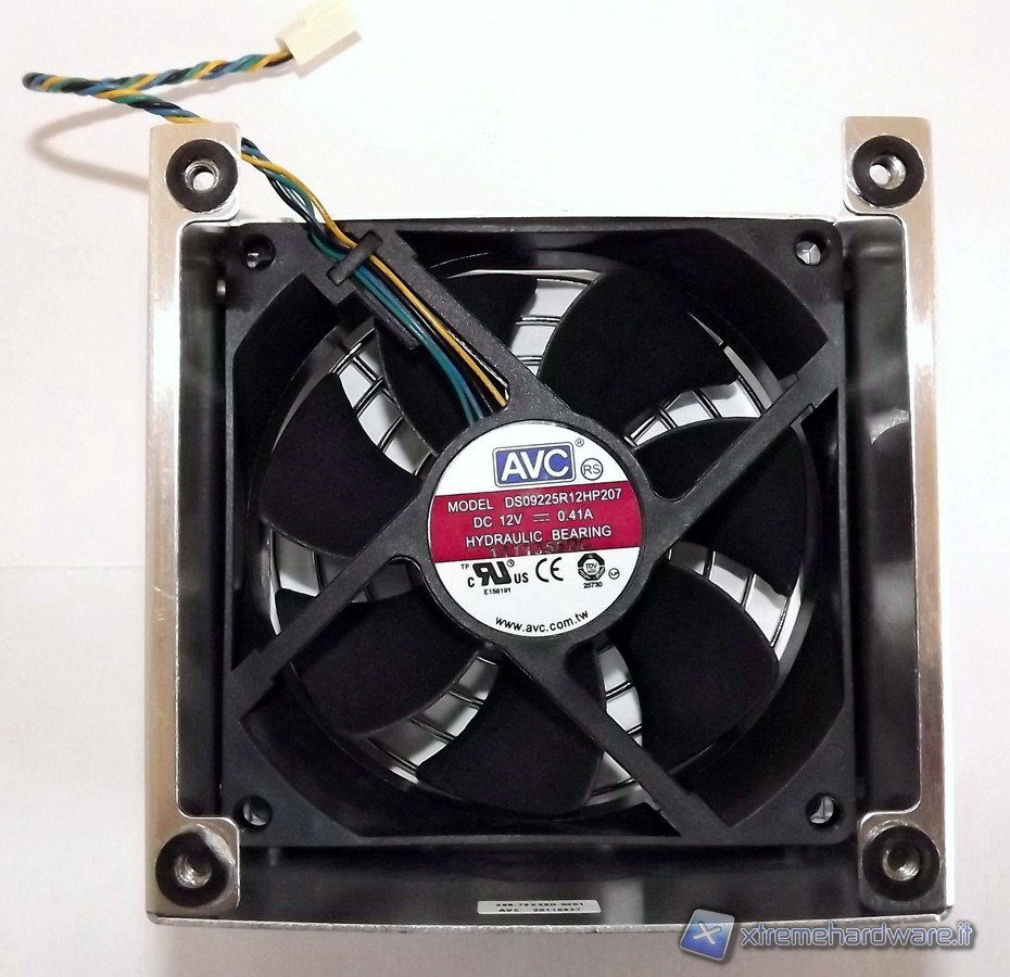 La ventola si trova protetta dentro un piccolo chassis dove è anche installata una griglia protettiva. La ventola ha serigrafata il marchio AVC, sempre prodotto a Taiwan ed è di tipo bearing idraulica con la sigla DS0922R12HP207 e connettore a 4pin, quindi in grado di essere termo regolata. Il dissipatore ICE di Shuttle è dodato di una base in rame, non lucidata a specchio; il corpo invece è in alluminio e da questa partono 3 heat-pipe che entrano nel corpo di fitte lamelle. Sia heat-pipe che pacco lamellare sono in alluminio. Nella base del dissipatore è presente un'etichetta che avverte che questo dissipatore va usato per CPU con un TDP massimo di 95W. Non è questo un problema in quanto le attuali CPU Intel di seconda generazione hanno un massimo di 95W per quanto riguarda il Thermal Design Power.
