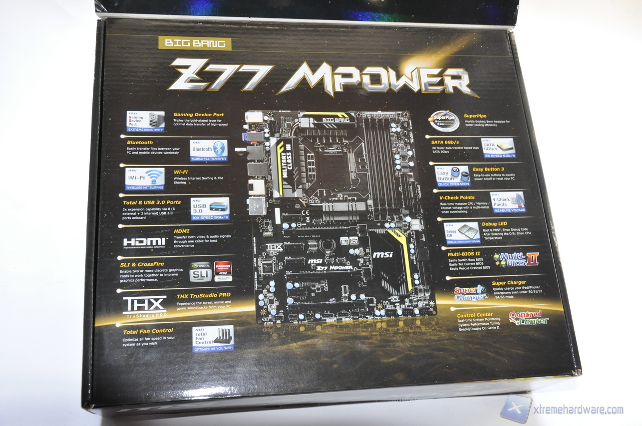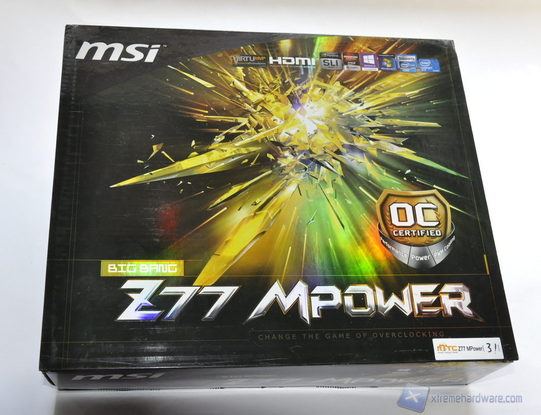 La scatola si presenta con un colore a fondo verde con il simbolo in evidenza relativo alla certificazione della Z77 Mpower per l’overclock.