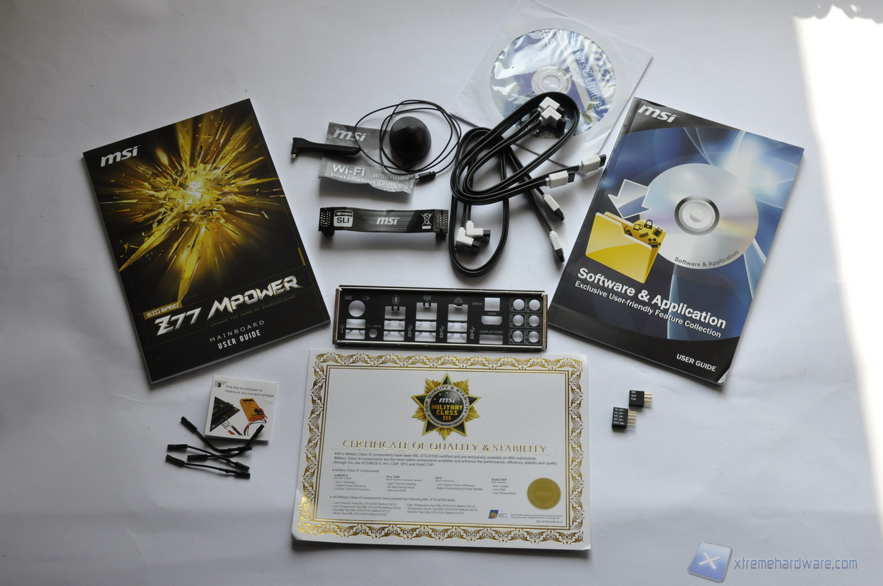 Il bundle è abbastanza ricco e trattandosi di una scheda votata all’overclock non manca nulla di ciò che serve, compresi gli adattatori per tenere fermi i puntali del multimetro. Troviamo inoltre un bridge SLI due diverse antenne per il modulo WiFi e 4 cavi SATA.