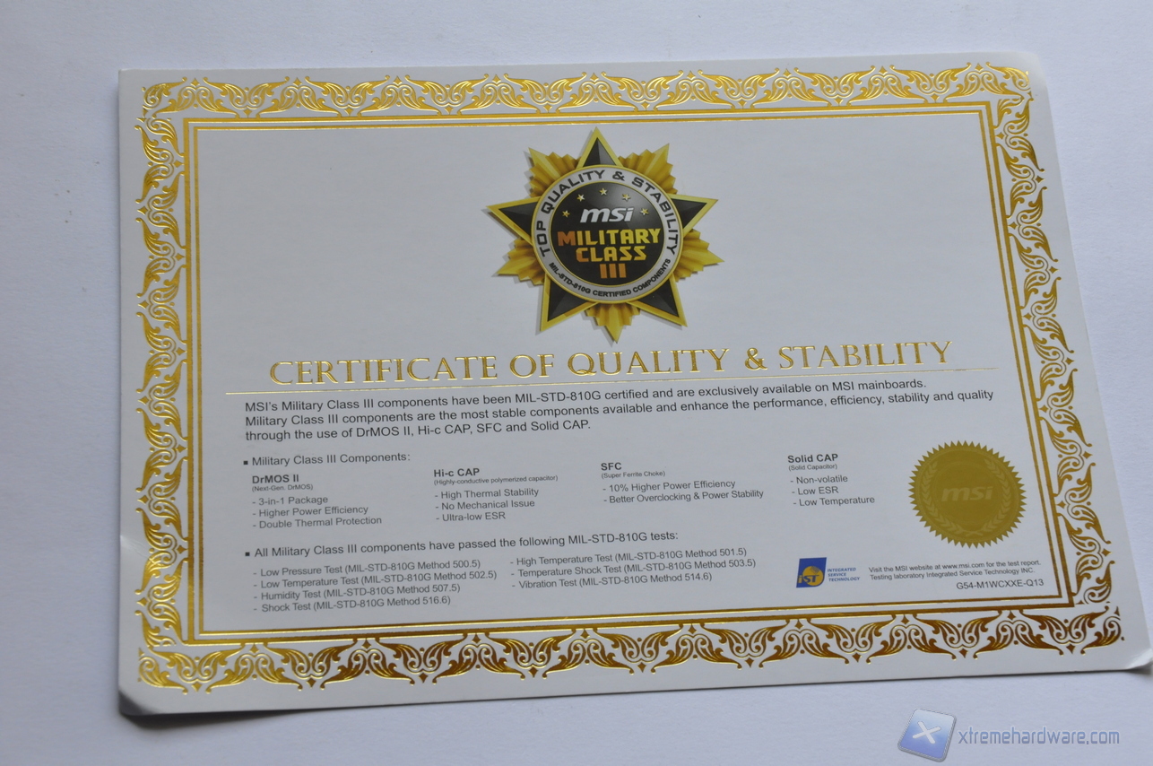 Altro orgoglio di casa MSI è il certificato di qualità che troviamo nel bundle con in basso a destra, sotto lo stemma, il numero identificativo rilasciato dal laboratorio che effettua i controlli qualitativi.