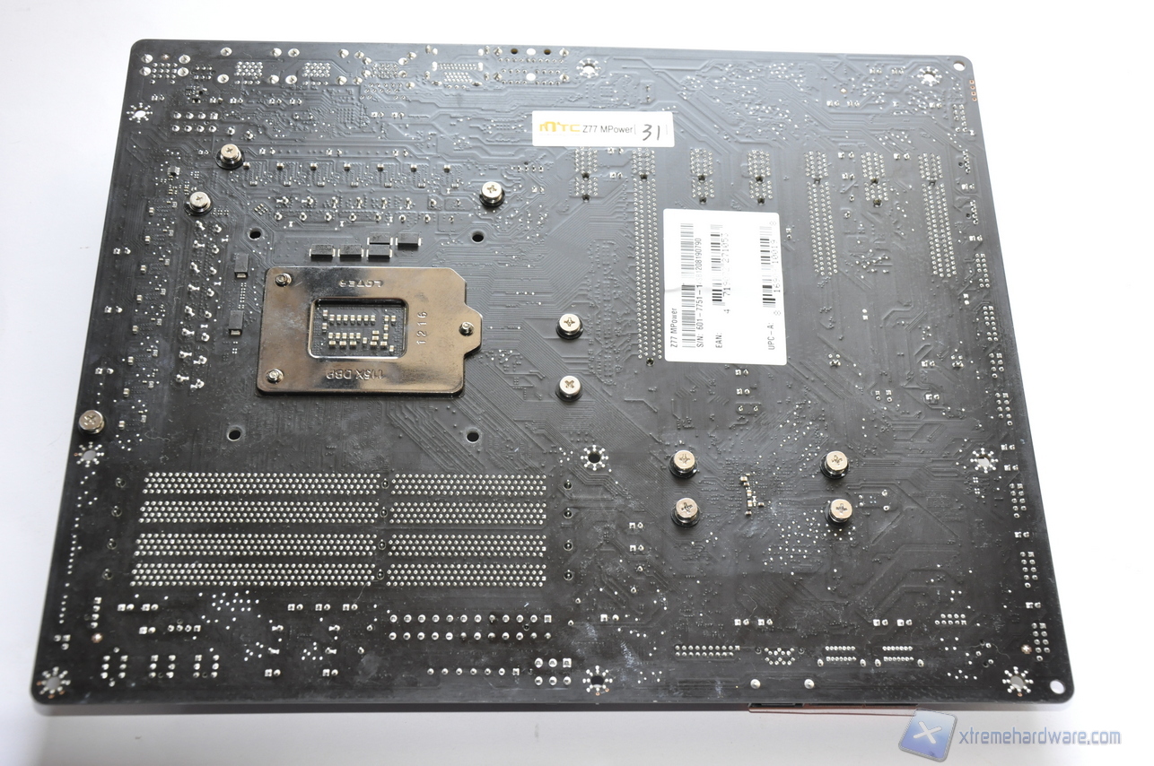 La parte sottostante al PCB si presenta abbastanza pulita e lineare; risaltano le viti di ritenzione delle flange dissipatrici nonché la staffa di ritenzione del sistema di chiusura del socket 1155. Alcuni dei condensatori Hi-C Cap sono stati piazzati nel retro della scheda madre, in modo da rendere più pulito il layout soprastante.