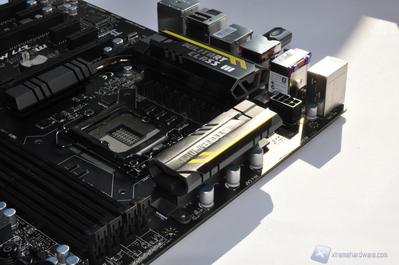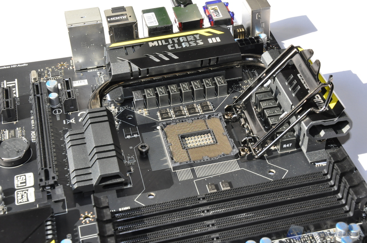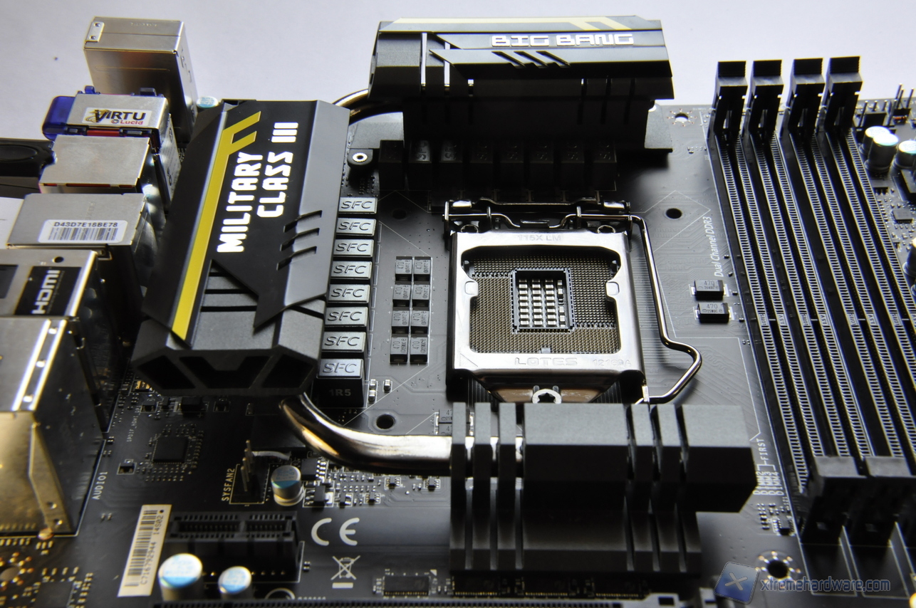 Ritornando nella zona socket quale cuore pulsante della scheda che appunto ospita il processore, si nota essere abbastanza libera grazie all’adozione di condensatori al tantalio Hi-C Cap. Le tre grosse flange posate direttamente sulle fasi di alimentazione sono unite dalla SuperPipe da 8mm in rame placcato Nickel. In tal modo viene distribuito il calore e convogliato attraverso l’Heatpipe nelle zone più fredde. Ricordiamoci che tutte queste soluzioni possono sembrare eccessive, ma per test particolarmente onerosi come LinX, la sezione di alimentazione viene sollecitata non poco ed il calore emesso deve in qualche modo essere smaltito, specie in quelle situazioni dove è presente il raffreddamento a liquido ed è assente la/le ventola/e presenti sui dissipatori ad aria che indirettamente con il loro flusso d’aria raffreddano anche la zona circostante.