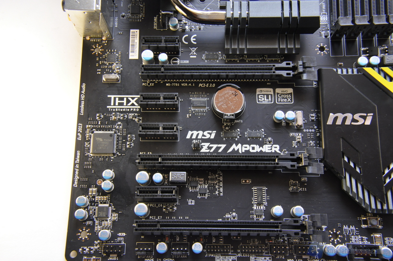 Continuiamo l’analisi del PCB con un’overview dei 7 slot PCI Express, nell’ordine x1, x16, x1, x1, x16, x1, x16. La disposizione è molto razionale e permette sia l’installazione di dissipatori CPU di grandi dimensioni, che potrebbero intralciare il primo slot PCI Exprss sia di schede video triple slot in configurazione doppia. Ricordiamo che la MSI Z77 Mpower sfrutta direttamente le 16 connessioni PCI Express 3.0 della CPU. senza ulteriori chip intermedi in grado di replicarne le linee. Pertanto la massima configurazione installabile su una CPU Ivy Bridge è di tipo 8x/4x/4x.