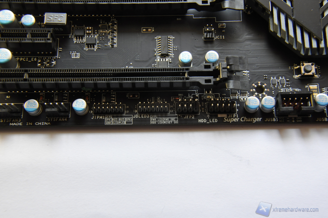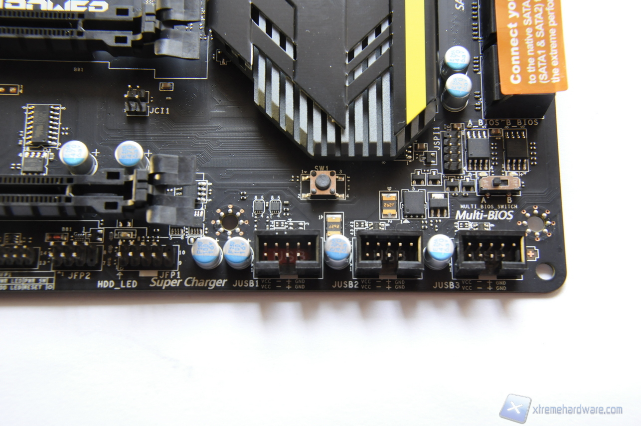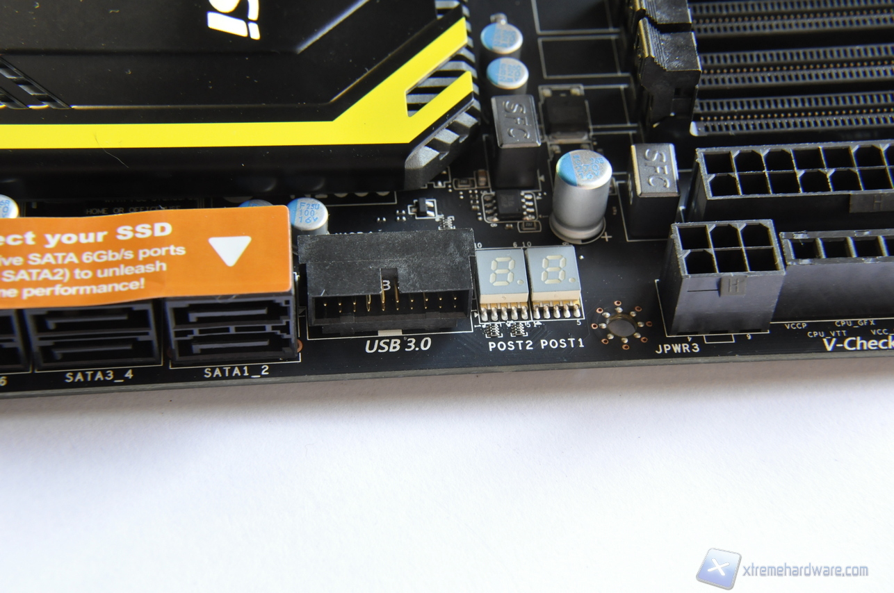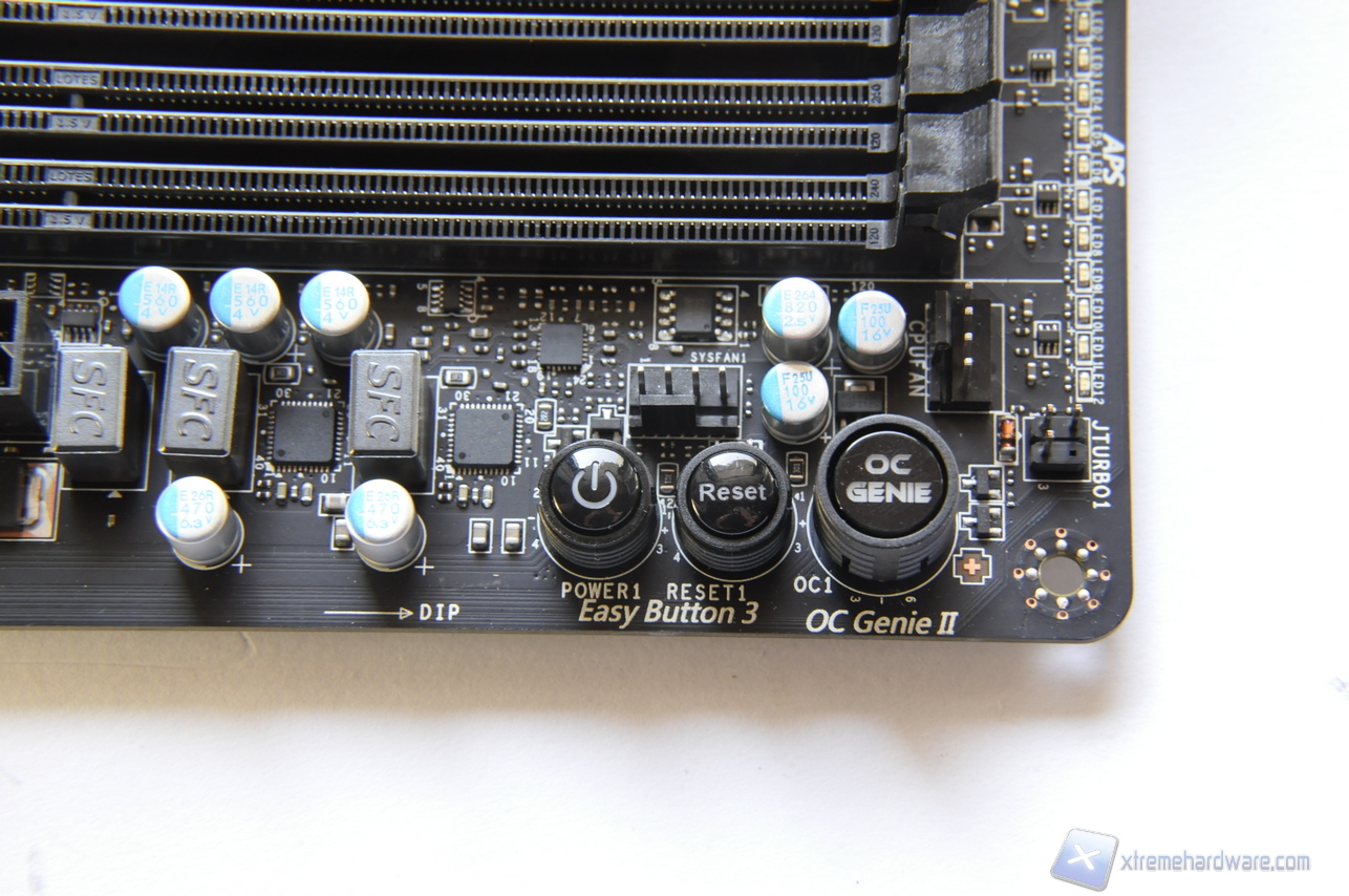 Nell’angolo in alto a destra troviamo i pulsanti di power e reset per l’utilizzo a banco della scheda madre. E’ inoltre presente il pulsante OC Genie che consente un overclock istantaneo a 4.6 GHz delle CPU Ivy bridge K. Sempre in questa zona troviamo il connettore per il MultiConnect Panel che permette di replicare queste funzioni sulla parte frontale del case.