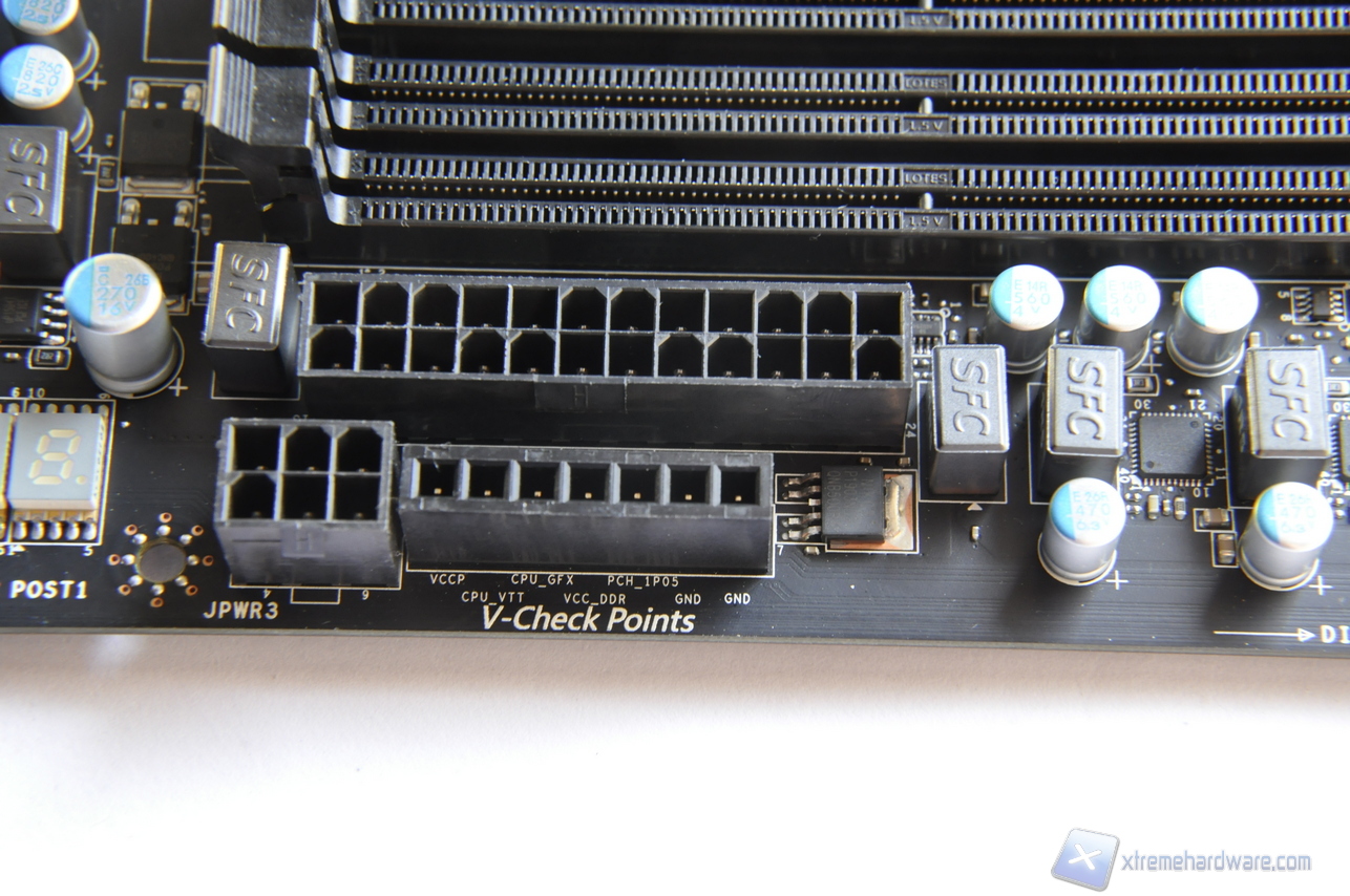 Passando alla zona superiore, troviamo il classico connettore ATX 24 pin e di fronte i punti di lettura per le varie tensioni della scheda madre (nell’ordine partendo dall’alto troviamo due pin di Ground, tensione PCH, RAM, IGP, VTT e VCore). E’ inoltre presente un connettore di alimentazione PCI Express 6 pin per fornire corrente addizionale alle schede grafiche.