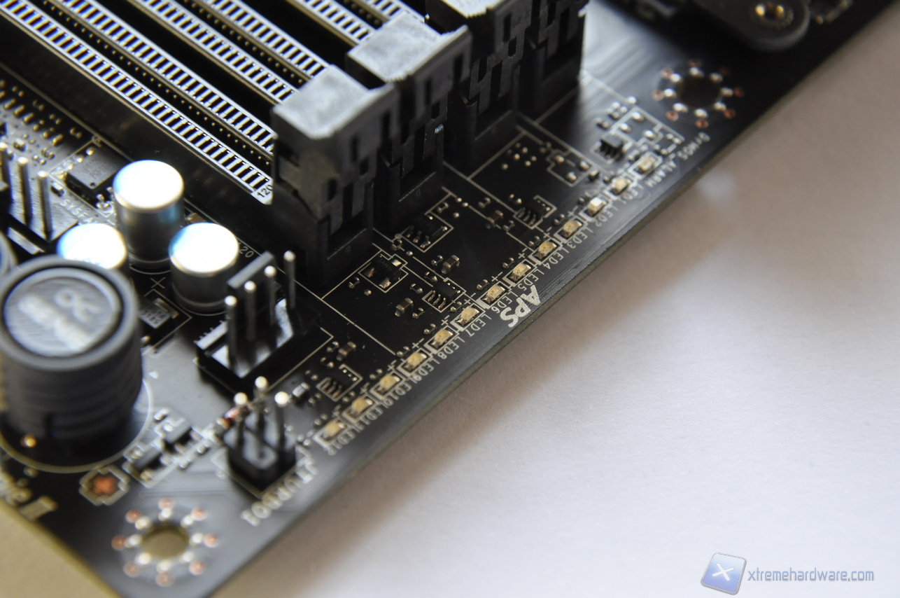 Sul bordo superiore troviamo infine 12 LED che ci stanno ad indicare lo stato di operatività di ciascuna delle fasi dedicata ai core. Esse sono infatti gestite dinamicamente dalla tecnologia APS al fine di limitare il consumo della scheda madre quando il carico sulla CPU è limitato.