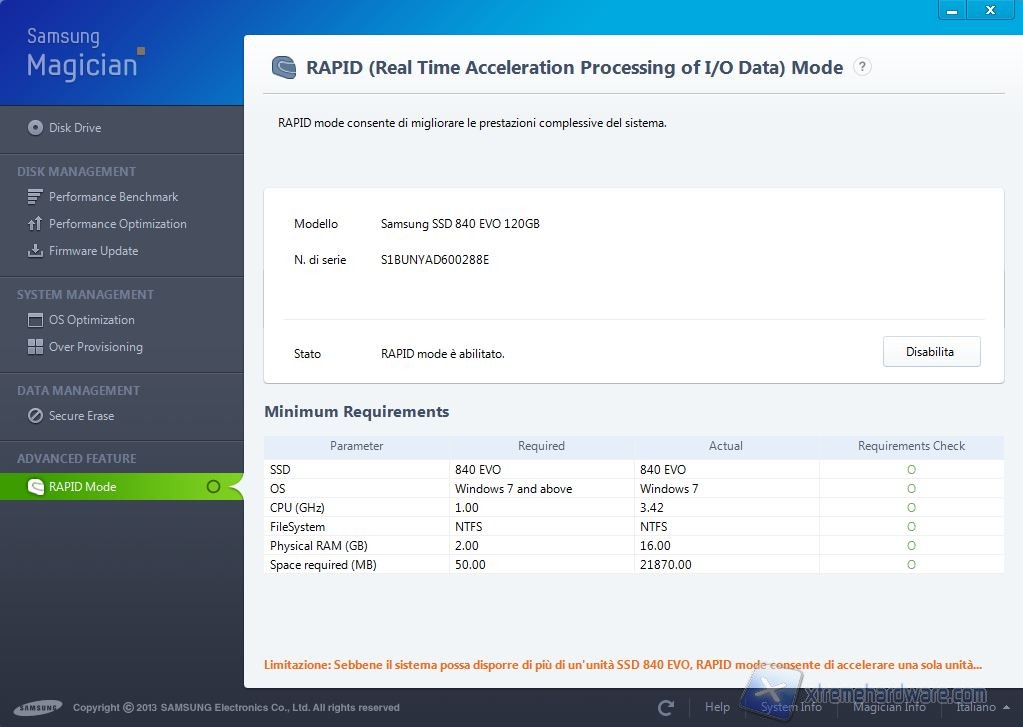 Il software proprietario Samsung SSD Magician è ottimo per tenere sotto controllo il proprio driver ed ottimizzarlo ed è migliorato molto con le ultime release. Nell'ultima versione, precisamente la 4.2.1, è possibile usufruire della funzione RAPID Mode, Real-time Accelerated Processing of I/O Data, attivabile solo ed esclusivamente per gli 840 EVO. Anche se è possibile installare più SSD nello stesso PC, la funzione potrà essere attivata solo sul singolo SSD, o almeno per il momento.